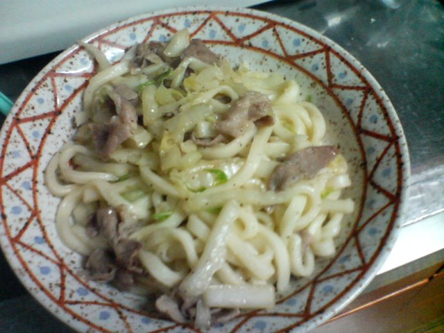作り方なんてのは説明するまでもなく、焼きうどんと一緒です。豚肉と白菜を塩コショウ振りながら炒めてうどんを入れて、オイスターソースや鶏がらスープ、中華スープの素で味付けするだけ。